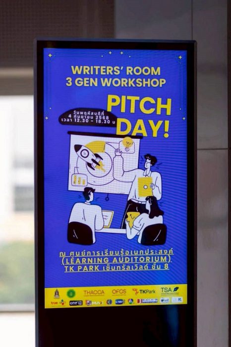 หลังจากเปิดโปรเจ็กต์สุดสร้างสรรค์ เพื่อพัฒนานักเขียนบทไทย 3 เจเนอเรชั่น ให้สามารถเดินหน้าผลิตผลงานได้อย่างน่าสนใจและส่งเสริมการพัฒนาคอนเทนต์ไทยให้แข่งขันได้ในตลาดโลกเมื่อเดือนมิถุนายนที่ผ่านมา โครงการ “Writers’ Room 3 Gen Workshop” ซึ่งสมาคมนักเขียนบทละครโทรทัศน์ (TSA) ร่วมกับพันธมิตรทั้งภาครัฐและเอกชน อาทิ กรมส่งเสริมวัฒนธรรม กระทรวงวัฒนธรรม, THACCA สำนักงานส่งเสริมวัฒนธรรมสร้างสรรค์, OFOS – One Family One Soft Power, อุทยานการเรียนรู้ TK Park, True CJ Creation, ช่อง One31, ช่อง 3, ช่อง 7HD, GMMTV, MONOMAX ฯลฯ จัดขึ้น ได้เดินทางมาถึงโค้งสุดท้ายแล้ว กับกิจกรรม “Pitch Day” เปิดเวทีแห่งโอกาสให้นักเขียนบทรุ่นใหม่ที่ผ่านเข้ารอบสุดท้าย ได้นำเสนอไอเดียต่อสถานีโทรทัศน์ สตูดิโอผู้ผลิตชั้นนำ และแพลตฟอร์มสตรีมมิ่งต่างๆ เมื่อวันที่ 3 กันยายน 2568 ณ ศูนย์การเรียนรู้อเนกประสงค์ (Learning Auditorium) TK Park ชั้น 8 เซ็นทรัลเวิลด์