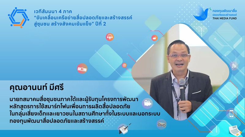 เวทีเสวนาหัวข้อ “แลกเปลี่ยน เรียนรู้ ร่วมกันสร้างนิเวศสื่อปลอดภัยสู่สังคม” ซึ่งวิทยากรตัวแทนภาคใต้ ที่ร่วมแชร์ประสบการณ์การทำงานร่วมกับกองทุนพัฒนาสื่อปลอดภัยและสร้างสรรค์ ได้แก่