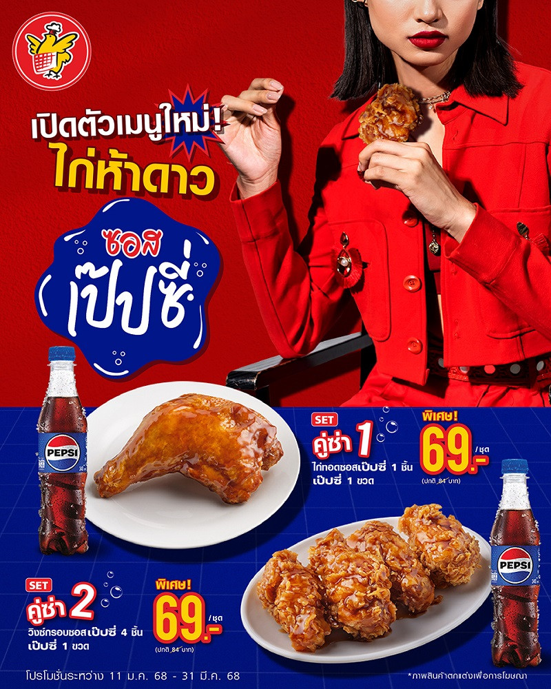 แคมเปญ “คู่ซ่าไฟว์สตาร์เป๊ปซี่” เปิดประสบการณ์ความอร่อยคุ้มแนวใหม่ เอาใจคนชอบลอง ครั้งแรกกับการผสานซอสเป๊ปซี่เข้ากับความกรอบอร่อยของเมนูไก่ทอดห้าดาว กับสองเมนูใหม่ เริ่มจาก “ไก่ทอดซอสเป๊ปซี่” ให้คุณอร่อยเต็มคำกับไก่ทอดส่วนน่องสะโพกชิ้นโตเคลือบซอสเป๊ปซี่ และ “วิงซ์กรอบซอสเป๊ปซี่” ลิ้มรสความกรอบนอกนุ่มในของปีกไก่บนชุบแป้งทอดเคลือบซอสเป๊ปซี่ ที่ให้คุณอร่อยคุ้มแบบจุใจถึง 4 ชิ้น ไก่ทอดห้าดาวทั้งสองเมนูถูกเคลือบมาด้วยซอสเป๊ปซี่รสกลมกล่อมซ่าถึงใจ นับเป็นการรังสรรค์ความอร่อยรสชาติใหม่ได้อย่างลงตัว พร้อมเพิ่มความคุ้มซ่าให้มื้ออร่อยของคุณด้วยการจับคู่คอมโบ เซต “ไก่ทอดซอสเป๊ปซี่” หรือ “วิงซ์กรอบซอสเป๊ปซี่” กับเครื่องดื่มเป๊ปซี่ ขนาด 340 มล. ในราคาสุดพิเศษเพียงชุดละ 69 บาท (จากราคาปกติ84 บาท)