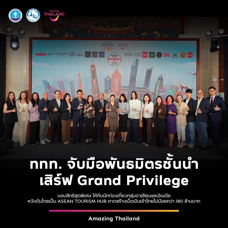 เมื่อวันที่ 13 กุมภาพันธ์ 2568 ณ ห้องโถงธนรัชต์ อาคาร ททท. กระทรวงการท่องเที่ยวและกีฬา โดยการท่องเที่ยวแห่งประเทศไทย (ททท.) เปิดตัวโครงการ ASEAN + INDIA SHOPPERS IN THAILAND 2025 อีกหนึ่งโครงการภายใต้แคมเปญ Amazing Thailand Grand Tourism and Sports Year 2025 โดยมี นางสาวฐาปนีย์ เกียรติไพบูลย์ ผู้ว่าการการท่องเที่ยวแห่งประเทศไทย (ททท.) ให้เกียรติเป็นประธานในพิธี พร้อมด้วยคุณสราวุธ มนูทัศน์ ผู้อำนวยการส่วนงานธุรกิจตลาดนักท่องเที่ยว บริษัท คิง เพาเวอร์ คอร์ปอเรชั่น จำกัด คุณดลลัชนัย สุทธารมณ์ ผู้ช่วยกรรมการผู้จัดการฝ่ายการตลาดต่างประเทศ บริษัท เซ็นทรัลพัฒนา จำกัด (มหาชน) คุณทิพมาศ เกษี ผู้ช่วยกรรมการผู้จัดการฝ่ายการตลาด International Customers and Strategic Partnerships กลุ่มห้างสรรพสินค้าเซ็นทรัล ในเครือเซ็นทรัลรีเทล และนางสาวภัทรอนงค์ ณ เชียงใหม่ รองผู้ว่าการด้านตลาดเอเชีย และแปซิฟิกใต้  พร้อมหน่วยงานพันธมิตร ให้เกียรติเข้าร่วมงานฯ