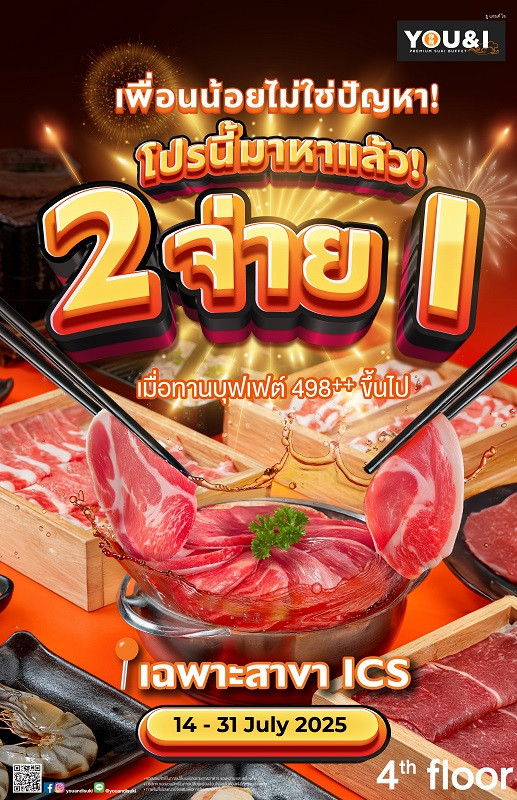 You & I เสิร์ฟโปรเด็ด! ชวนสายบุฟเฟ่ต์ “มา 2 จ่าย 1” ทุกวันตลอดเดือนกรกฎาคม 2568 เฉพาะสาขา ICS Lifestyle Complex ตรงข้ามไอคอนสยาม