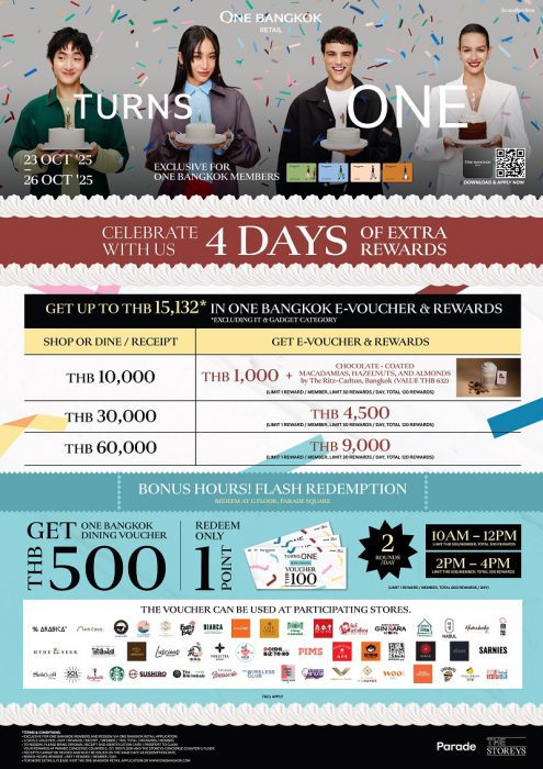 วัน แบงค็อก รีเทล (One Bangkok Retail) ได้ตอกย้ำความสำเร็จในฐานะแลนด์มาร์กค้าปลีกและไลฟ์สไตล์ใจกลางกรุงเทพฯ กับแคมเปญ “TURNS ONE” ตั้งแต่วันที่ 1 ตุลาคม ถึง 13 พฤศจิกายน 2568 ที่ออกแบบขึ้นเพื่อตอบโจทย์ผู้บริโภคยุคใหม่ที่ต้องการประสบการณ์การช้อปปิ้งที่ผสานความคุ้มค่า ความบันเทิง และการมีส่วนร่วมทางอารมณ์ (emotional engagement) เข้าไว้ด้วยกัน พร้อมของรางวัลมูลค่ารวมกว่า 20 ล้านบาท แคมเปญนี้สะท้อนถึงความเข้าใจพฤติกรรมผู้บริโภคที่ให้ความสำคัญกับความคุ้มค่าและสิทธิพิเศษ ไม่ว่าจะเป็น One Bangkok E-Voucher มูลค่าสูงสุด 30,900 บาท, แคมเปญ Top Spenders ที่กระตุ้นการใช้จ่าย, สิทธิพิเศษ Buy 1 Get 1 Free จากร้านอาหารชื่อดัง รวมถึงกิจกรรม Lucky Draw ที่มอบรางวัลใหญ่มูลค่ารวมกว่า 10 ล้านบาท อาทิ Mercedes-Benz GLC 220 d 4MATIC Avantgarde Diesel 2 มูลค่า 3,720,000 บาท และแพ็กเกจท่องเที่ยวสุดหรู