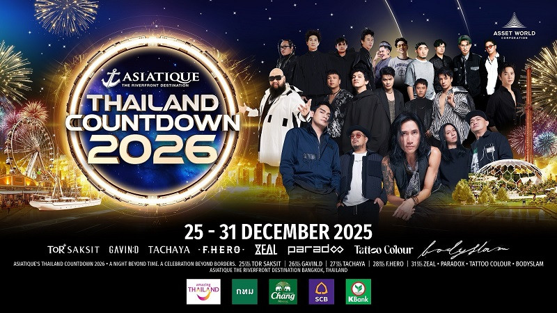 เอเชียทีค เดอะ ริเวอร์ฟร้อนท์ เดสติเนชั่น ภายใต้การบริหารงานของ แอสเสท เวิรด์ คอร์ปอเรชั่น (AWC) พร้อมด้วยพันธมิตร อาทิ การท่องเที่ยวแห่งประเทศไทย กรุงเทพมหานคร น้ำแร่ธรรมชาติตราช้าง ธนาคารไทยพาณิชย์ และ ธนาคารกสิกรไทย ผนึกกำลังจัดงาน “ASIATIQUE’s THAILAND COUNTDOWN 2026” สร้างสรรค์ประสบการณ์เฉลิมฉลองข้ามปีสุดยิ่งใหญ่ริมแม่น้ำเจ้าพระยา ครั้งแรกกับงานเคานต์ดาวน์ 5 วันเต็ม ตั้งแต่วันที่ 25 – 28 และ 31 ธันวาคม 2568
