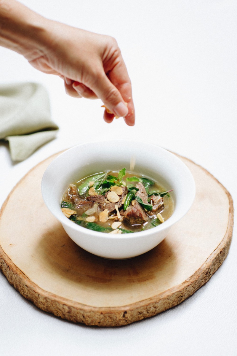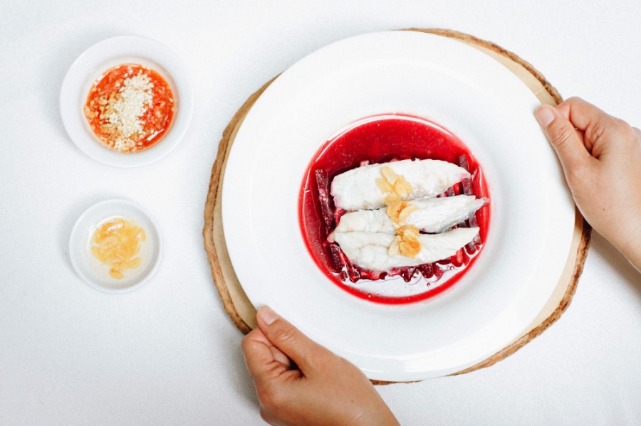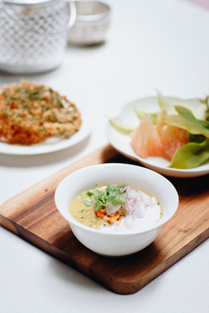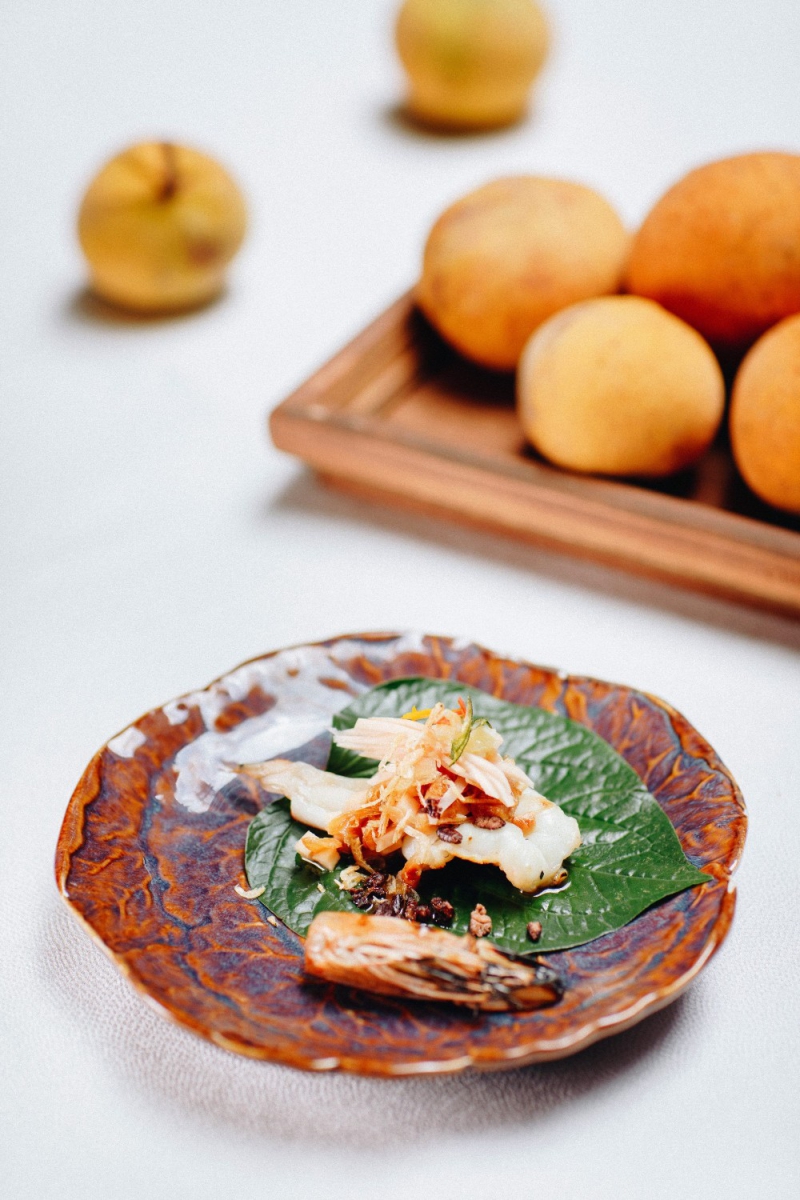 Chef Prin’s new rainy season menu puts an emphasis on ingredients – especially fruits and vegetables – that grow during Thailand’s summer rains, like the santol tropical fruit, or cotton fruit; lychee; beetroot; palm fruit; liang leaf; suaeda maritima, or herbaceous seepweed; and young mangosteen. These have a mellow sour taste that make up one of the five flavours of Thai cooking, and Chef Prin also uses spices and pepper in some dishes to help warm the body during the rainy season.