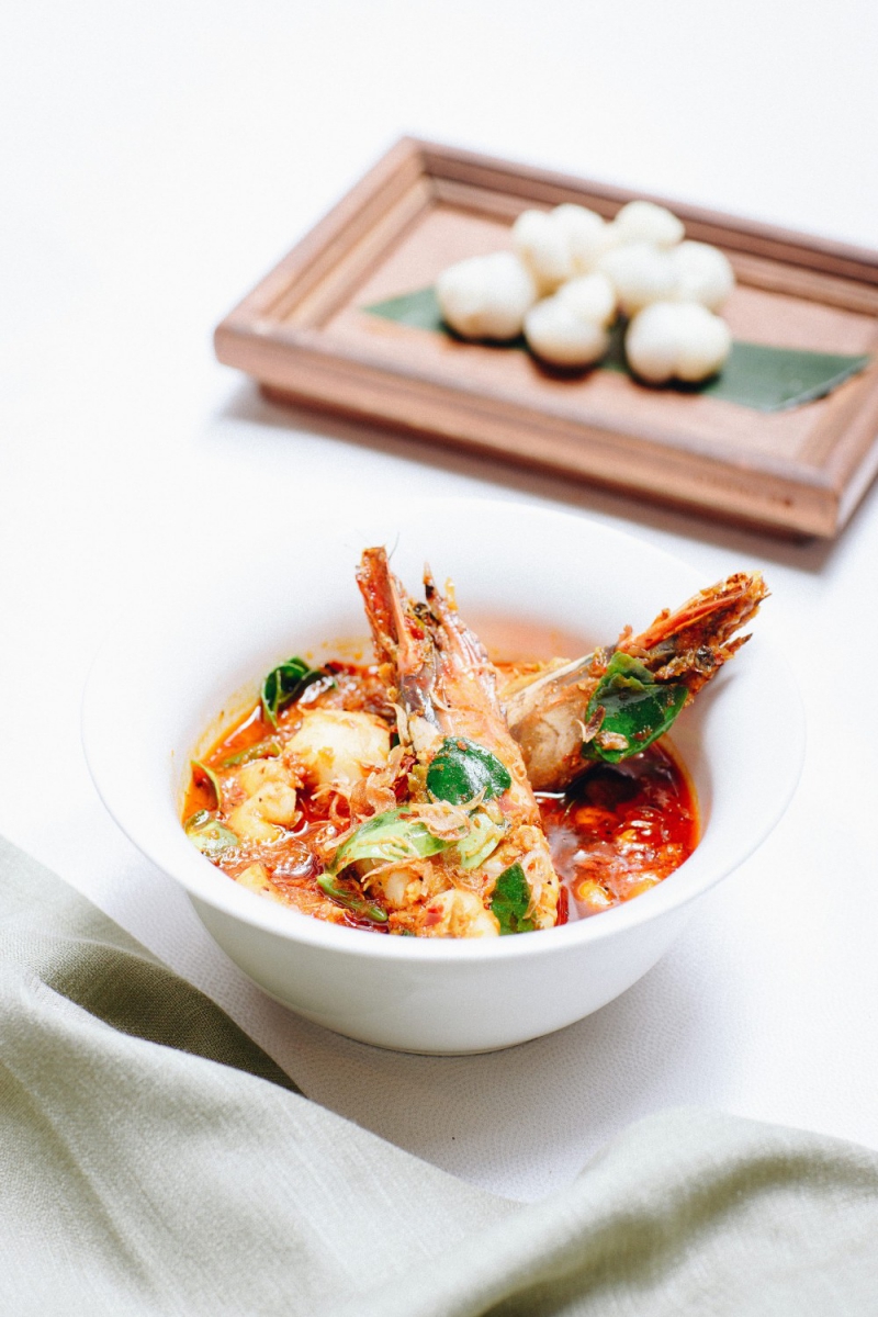 ‘Spice Market by SAMRUB SAMRUB THAI’ offers a 5-course lunch menu and a choice of 7- and 10-course dinner menus. Dishes include a starter of prawns with santol served on crunchy rice; a salad of grilled smoked duck breast with lychee and Thai basil; a relish of salted fourfinger threadfin fish and pork simmered in coconut cream with shallots, chilies and fermented rice, served with fresh fruits and fried vegetables; and tiger prawn curry with fresh young mangosteen.