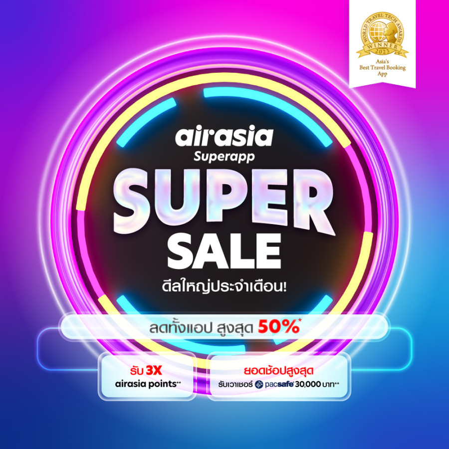 airasia Move (เดิมชื่อ airasia Superapp) ซูเปอร์แอปด้านการเดินทางและการท่องเที่ยวครบวงจรชั้นนำในภูมิภาคอาเซียนตั้งแต่การเดินทางทางอากาศจนถึงภาคพื้นดิน ลดสนั่นส่งท้ายปลายปีในแคมเปญ “Superapp Super Sale” ด้วยโปรลดสูงสุด 50%* พิเศษ ! ผู้ที่มียอดช้อปสูงสุด รับเวาเชอร์กระเป๋า Pacsafe Voucher มูลค่า 30,000 บาท ฟรี*